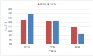 Do ostatniego eksperymentu wykonanego w IMP PAN w Gdańsku została również przedstawiona analiza temperatur w przestrzeni paleniska, która pozwoliła na wyznaczenie maksymalnych temperatur w strefie reakcji (TMAX) oraz temperatur płomienia (spalin, Tf). Rezultaty zaprezentowano zbiorczo na wykresach.