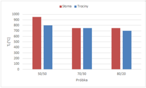 W ramach realizacji zadania w IMP PAN w Gdańsku kontynuowano również eksperymenty procesu spalania pomiotu kurzego przeprowadzone na reaktorze laboratoryjnym analizy makro-termograwimetrycznej. Na potrzeby eksperymentu wykonano sześć próbek peletu z pomiotu domieszkowanego odpowiednio trocinami oraz słomą w proporcjach masowych pomiotu do dodatku 50:50, 70:30, oraz 80:20. Próbki zostały wysuszone a ich zawartość wilgoci nie przekraczała 5%. Charakterystyka pomiotu, słomy oraz trocin przedstawiona została w tabeli.
