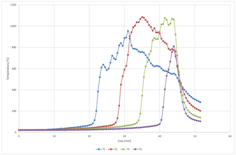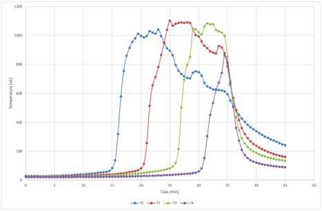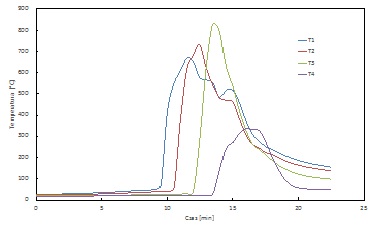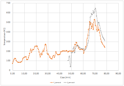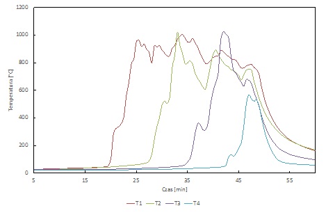 Do ostatniego eksperymentu wykonanego w IMP PAN w Gdańsku została również przedstawiona analiza temperatur w przestrzeni paleniska, która pozwoliła na wyznaczenie maksymalnych temperatur w strefie reakcji (TMAX) oraz temperatur płomienia (spalin, Tf). Rezultaty zaprezentowano zbiorczo na wykresach.