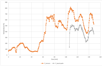 Podczas prowadzonych prac technicznych instalacji testowano nagrzewanie się złoża oraz temperaturę w środkowej części komory. Otrzymane wyniki wykazały, iż po ustabilizowaniu procesu spalania pomiotu w na całej powierzchni złoża oraz po wyłączeniu palnika wspomagającego, temperatura złoża osiągnęła 400 °C, a temperatura w komorze przekroczyła 800 °C (po czasie 200 min od startu procesu).