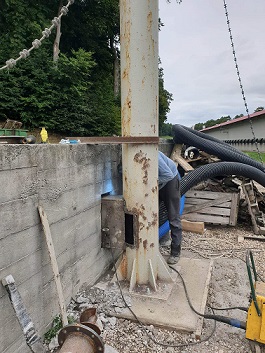 Kolejnymi pracami jakie są wykonywane u Pana Zygmunta przy piecu to podłączenie go do komina. Nastąpiło wykłucie dziury w betonowej ścianie, po czym trzeba było przyspawać łącznik kominowy do komina.